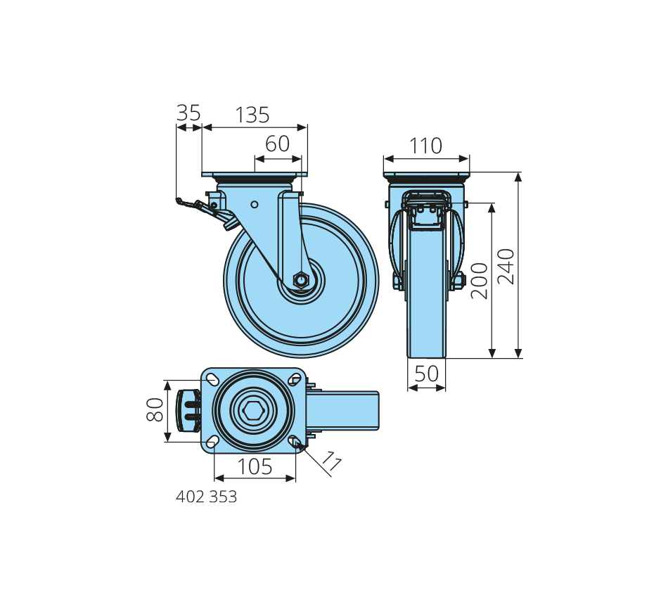 Roue pivotante pour charge lourde200x50mm, capacité de charge dyn. 1000kg, bandage polyuréthane, jante fonte, roulement à billes, ave